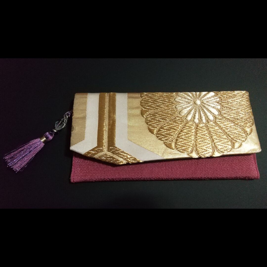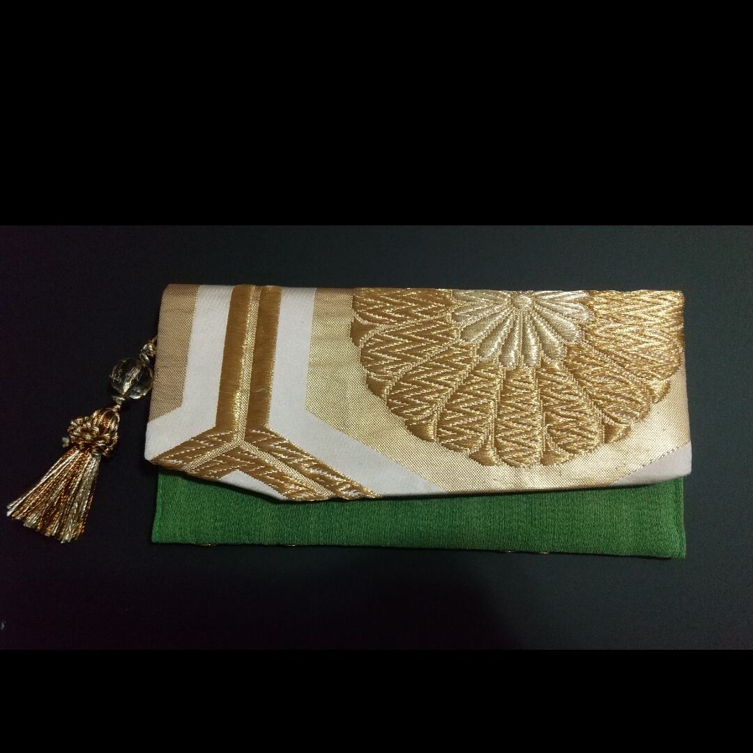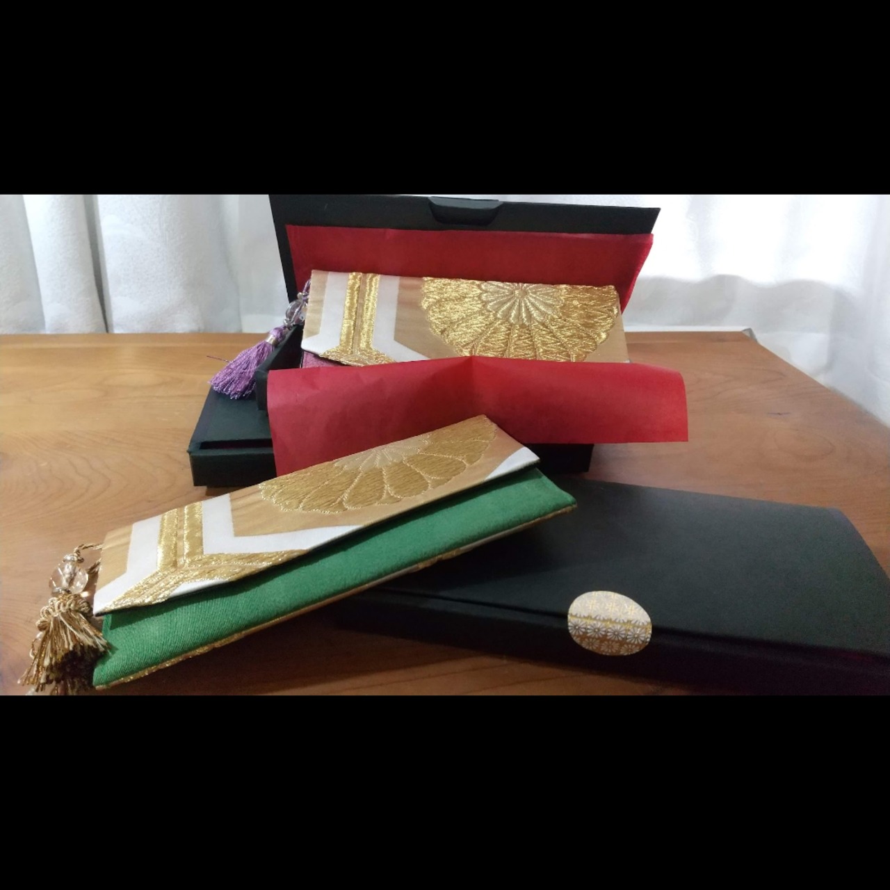 金襴の帯を本体柄に、落ち着いた鶯色と鴇色の2種類の着物地を選定した華やかでいて上品な