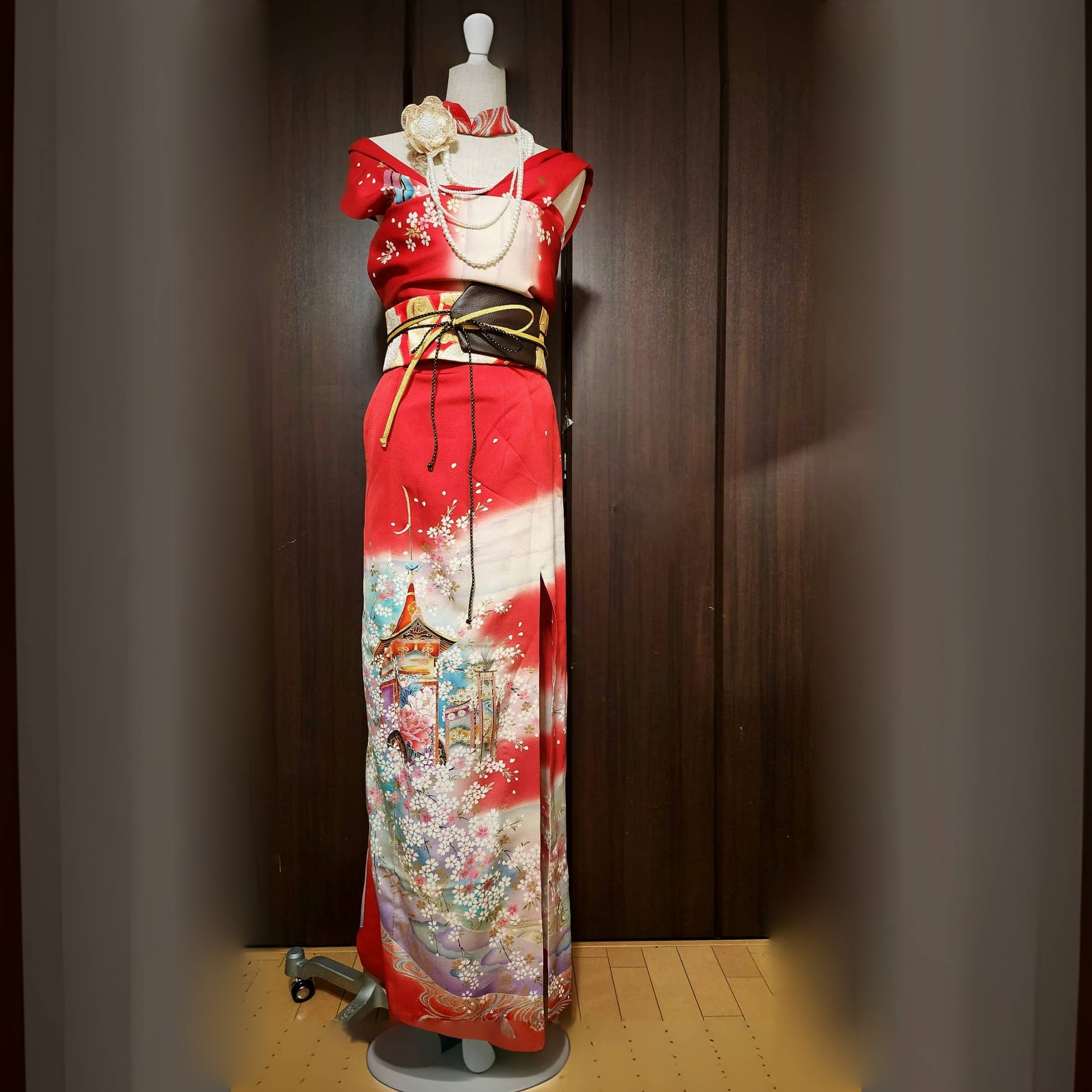 一部刺繍の入った色留袖から作ったリメイクドレスです。こちらのデザインの特徴は、ドレス上部は約2mの長さの布が左右にあり、色々な巻き方次第でデザインを変えられます。