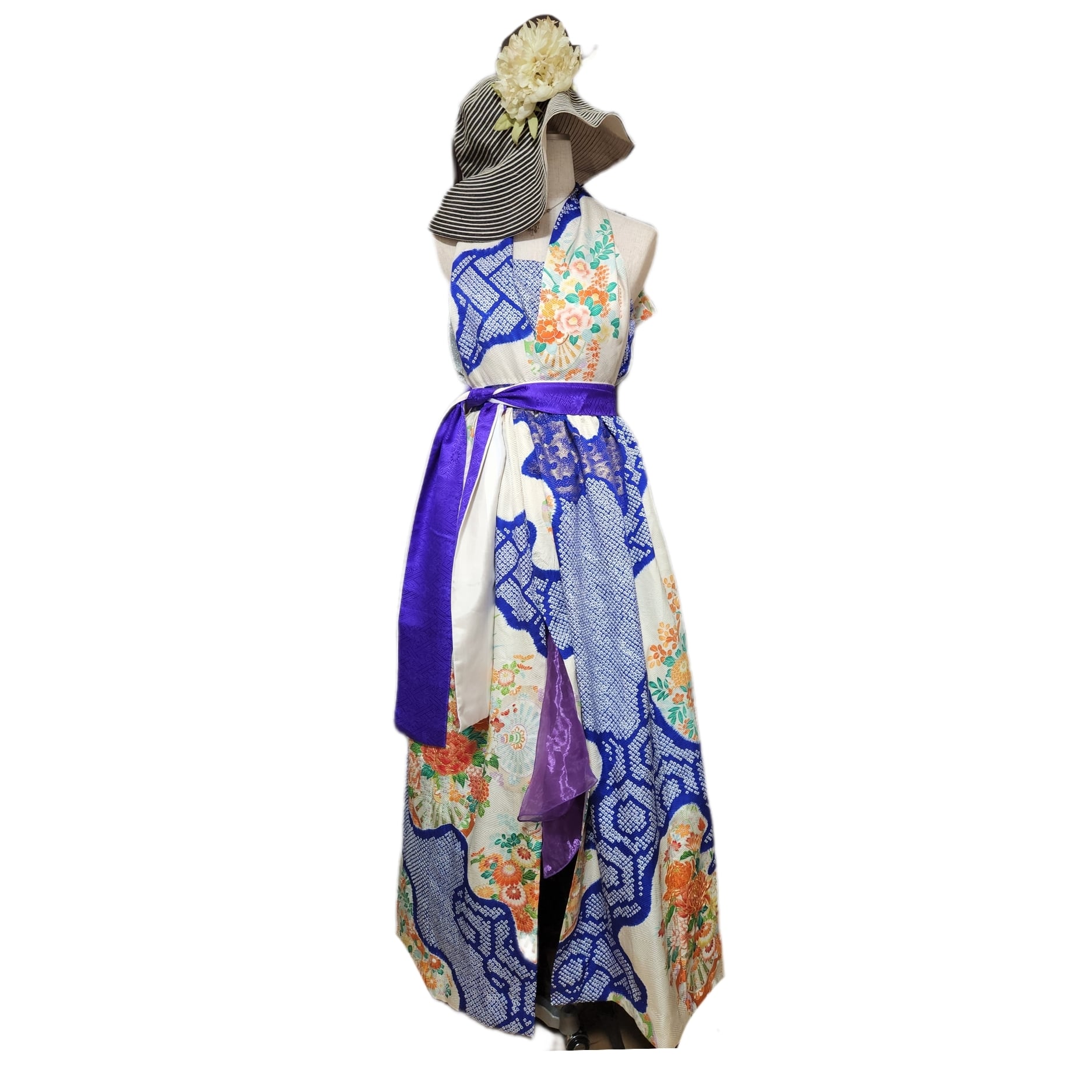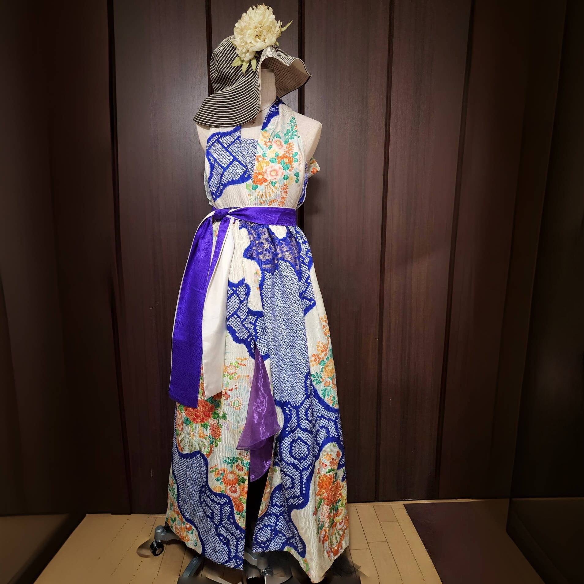 一部刺繍の入った振り袖から作ったリメイクドレスです。こちらのデザインの特徴は、ドレス上部は約2mの長さの布が左右にあり、色々な巻き方次第でデザインを変えられます。